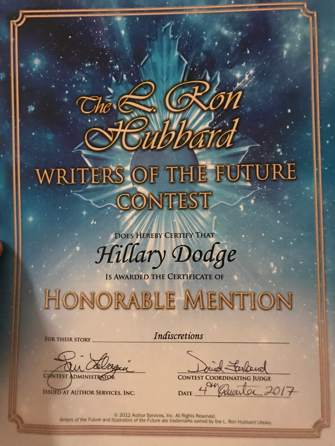 For those of you in the know, you get how huge this is. For those of you not in the know, let me explain. L. Ron Hubbard, other than being known for Scientology, was first and foremost a science fiction writer. He began this contest decades ago to help usher in the new age of science fiction writers and to encourage those with pens and big imaginations.